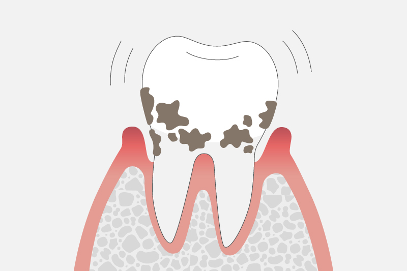 歯の動揺が大きい場合や、痛みなどの症状が強く出る場合があります。骨は大きなダメージを受けていて、出血や口臭などの症状も現れます。